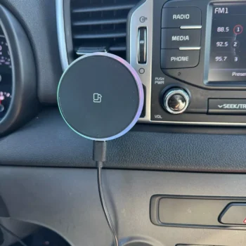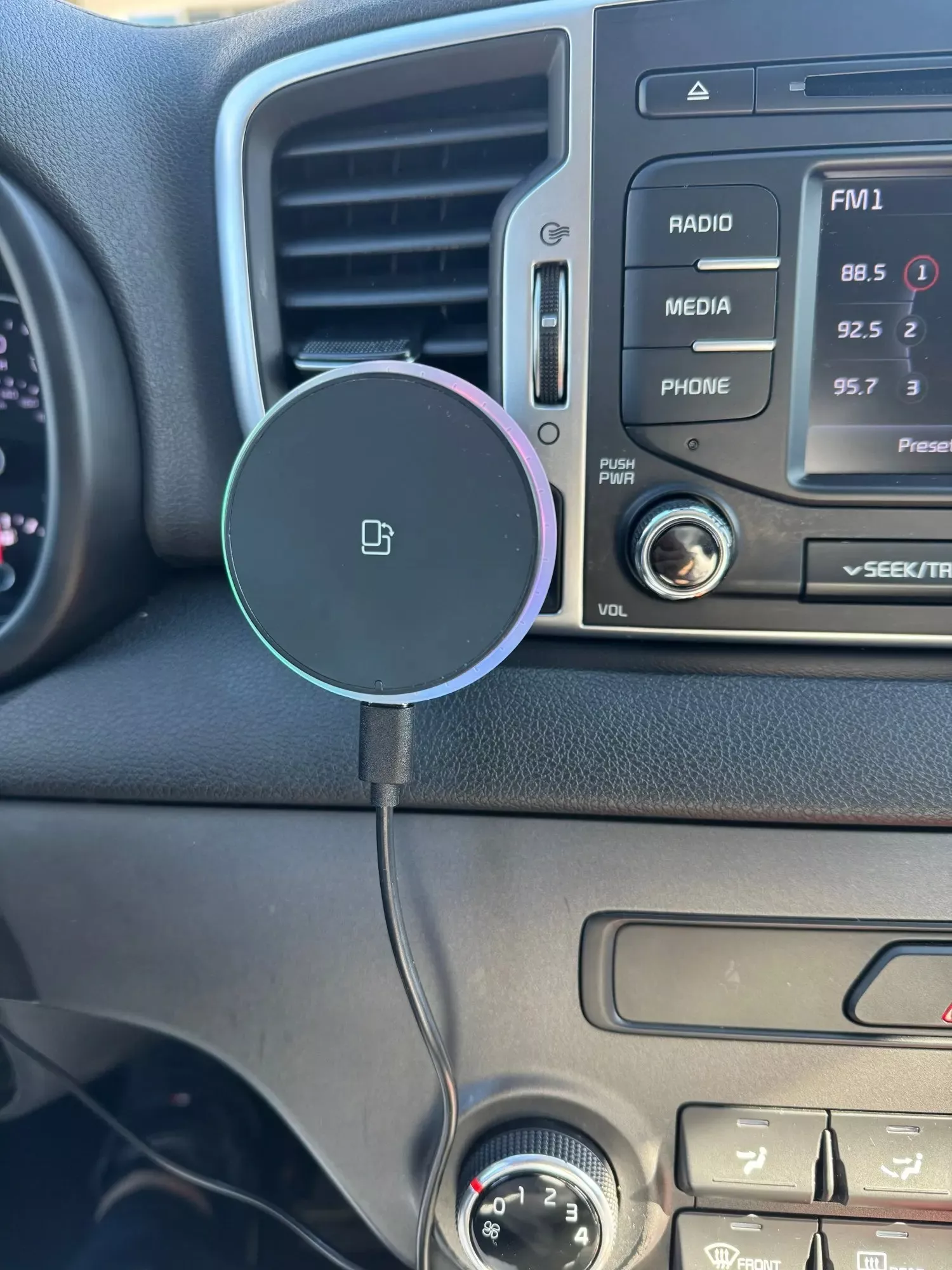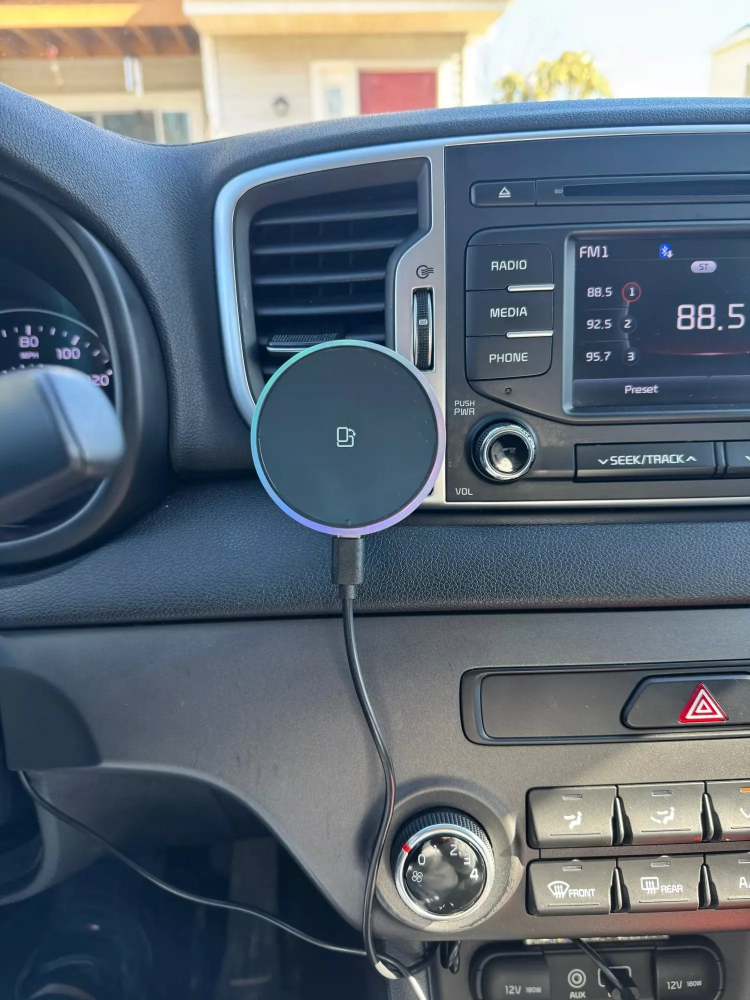 This wireless charger is built for simplicity and efficiency. It plugs directly into your car’s air vent, allowing easy installation without messy cables or suction cups. The 15-watt wireless charging delivers fast and reliable power, so your phone stays charged during long trips or busy commutes. What makes it stand out is the colorful LED light that adds a vibrant touch to your car’s interior, making charging status easy to see even at night. The charger is compatible with all Qi-enabled devices, making it a universal solution beyond just iPhones.