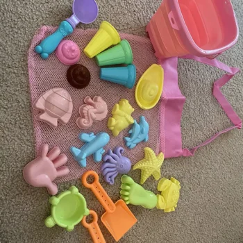 My kiddos are head over heels for this beach toy set, no joke. It's packed with a whopping 20 pieces and each one is cooler than the last! They're all about that collapsible pink bucket, it's been an absolute smash hit. The thing is so breezy to lug around and stash away when playtime wraps up. And let me tell you about those molds - they've got everything from dolphins to triceratops, it's like a mini zoo! Every time my little ones dive into playing with these toys, their imaginations just skyrocket - I'm talking next level creativity here! Plus, as a parent, there’s something super comforting knowing that all these playthings are crafted from top-grade non-toxic plastic with smooth edges; seriously puts my mind at ease knowing they're safe for my munchkins' hands. I mean who knew safety could look so fun? All in all, this beach toy set has become our go-to for sandy adventures and backyard shenanigans alike. It keeps the kids entertained while fueling their imagination - what more could you ask for? So if you’re on the hunt for some new outdoor toys your littles will love – don’t sleep on this set!