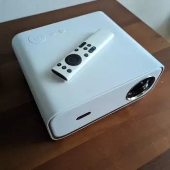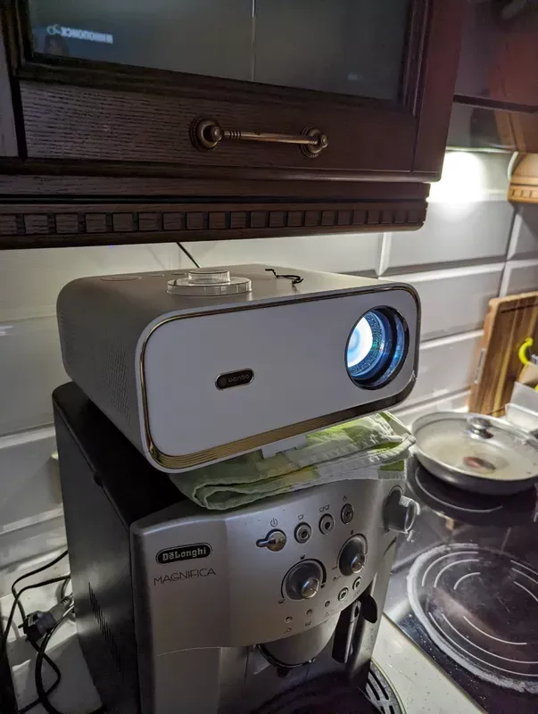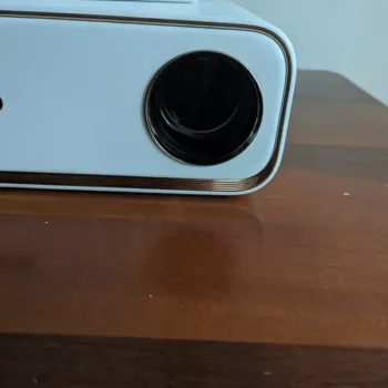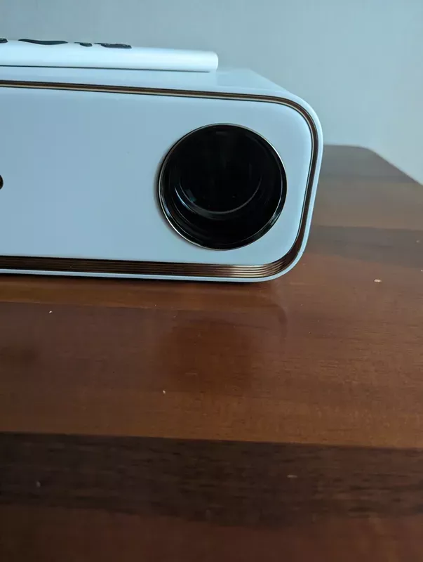 For the money, this projector's a solid pick. It's got a sleek, minimal look to it. A lens cover would've been nice, but it's just open as is. Feature-wise, it's pretty good, giving off decent brightness that lets you watch without needing pitch-black darkness. There's a slight jitter in super detailed scenes with lots of fine lines, like cityscapes in drone shots, probably due to the resolution. But overall, image quality, color, and brightness are solid for the price. The open lens does catch dust, which is mostly easy to blow off, but it's a bit annoying to clean every time. Best to keep it covered when not in use. The sound is surprisingly clear and good quality for the size. All up, it's a bright, solid buy.