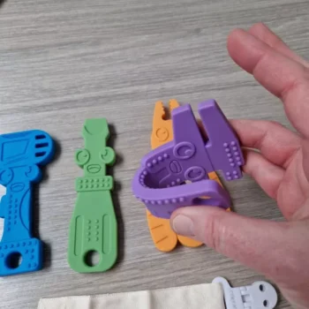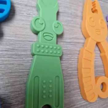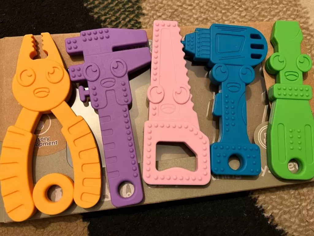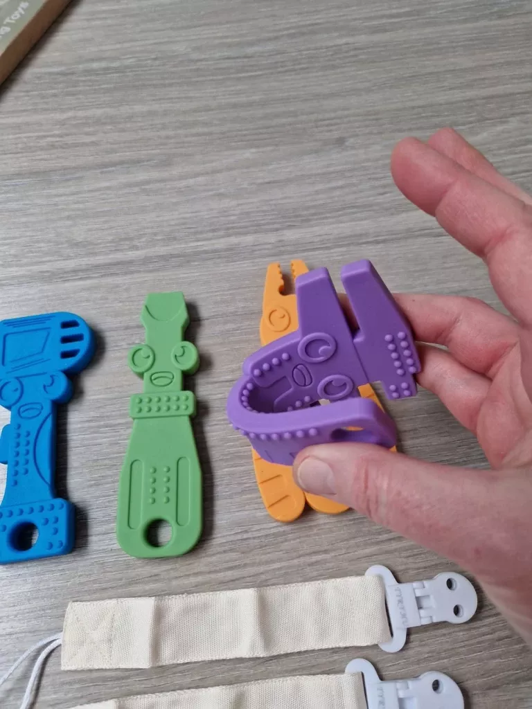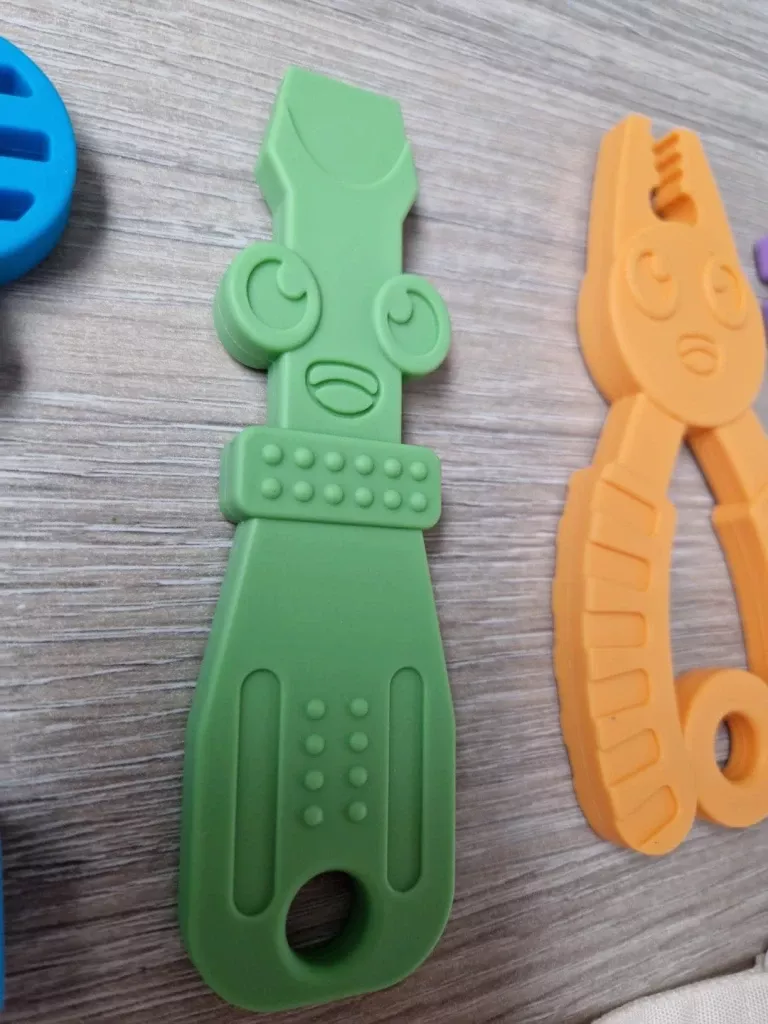 this set of silicone teethers has been an absolute blessing during the teething months the soft, flexible material provides soothing relief to my baby’s sore gums without feeling too hard or abrasive the wrench shapes are unique and inviting, sparking curiosity and encouraging my child to grasp and explore with their hands promoting fine motor skill development alongside sensory stimulation the bright yet gentle colors add visual appeal without overwhelming young eyes and the varied textures give tactile variety that keeps my baby engaged the lightweight design makes it easy for little hands to hold and carry around throughout the day cleaning is a breeze since the silicone is stain-resistant, dishwasher safe, and dries quickly the durability is impressive as the toys have maintained their softness, color vibrancy, and shape despite frequent chewing and washing this set combines comfort, safety, and developmental benefits in a playful and practical design it has quickly become one of my baby’s favorite toys and a reliable tool to ease the discomfort of teething i highly recommend it to parents seeking a well-rounded, enjoyable teething solution