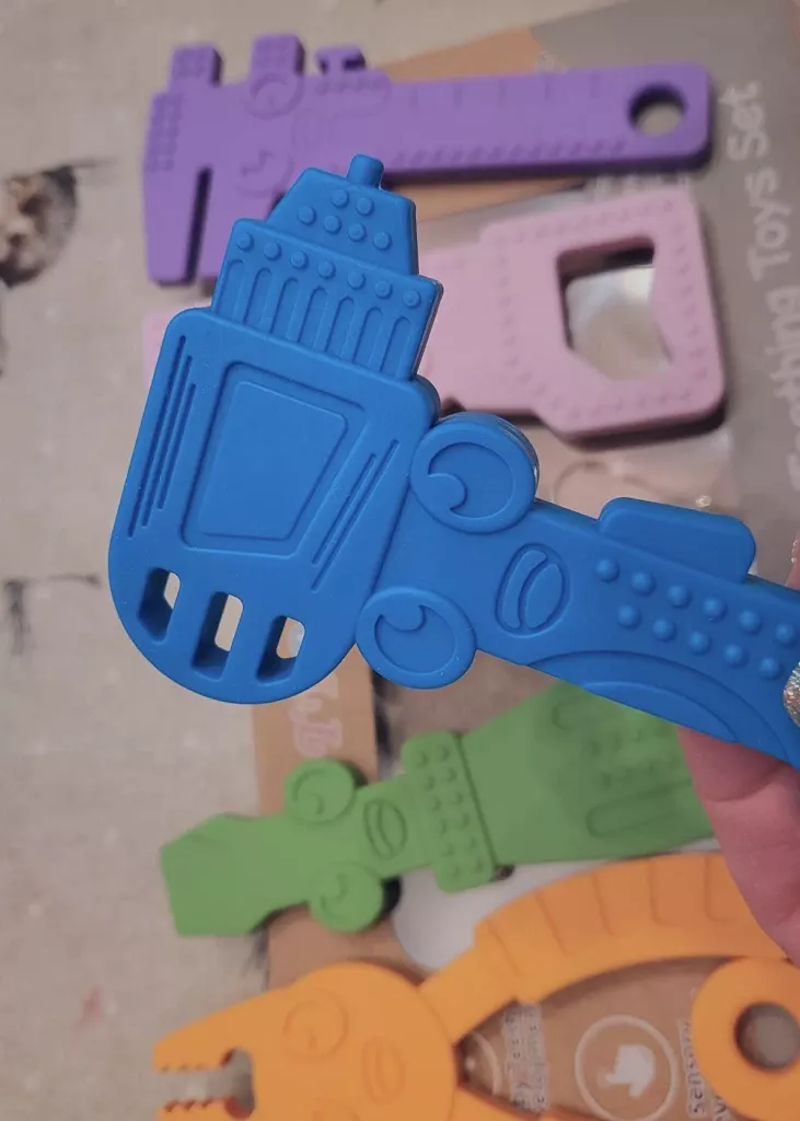i’m thoroughly impressed with this teether set that combines functionality, safety, and developmental benefits in one charming package the silicone wrenches are soft and pliable enough to provide effective relief for my baby’s sore gums while offering enough structure to withstand vigorous chewing the tool-inspired shapes keep my child engaged and curious, encouraging hand-eye coordination and fine motor skill growth the bright, inviting colors stimulate visual senses gently and the varied textures offer excellent tactile stimulation which is important for sensory development the lightweight pieces are easy for tiny hands to hold and carry around throughout the day the silicone is high quality, BPA-free, and non-toxic, ensuring safety and peace of mind the set is dishwasher safe and cleans easily without losing softness or color even after repeated washes durability is top-notch as the toys maintain their shape and texture despite frequent use this versatile and thoughtfully designed set has become a staple in our teething routine providing comfort and fun in equal measure i highly recommend it to anyone looking for a safe, engaging, and practical teething aid