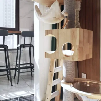 Our Cat Tree House stands out with its impressive five-layer structure, offering ample space for climbing, playing, and lounging. Crafted from high-quality, durable wood, it provides a stable and safe environment for your cat’s daily adventures. The variety of platforms, nests, and scratching posts cater to your cat’s natural instincts, promoting healthy exercise and claw maintenance.
