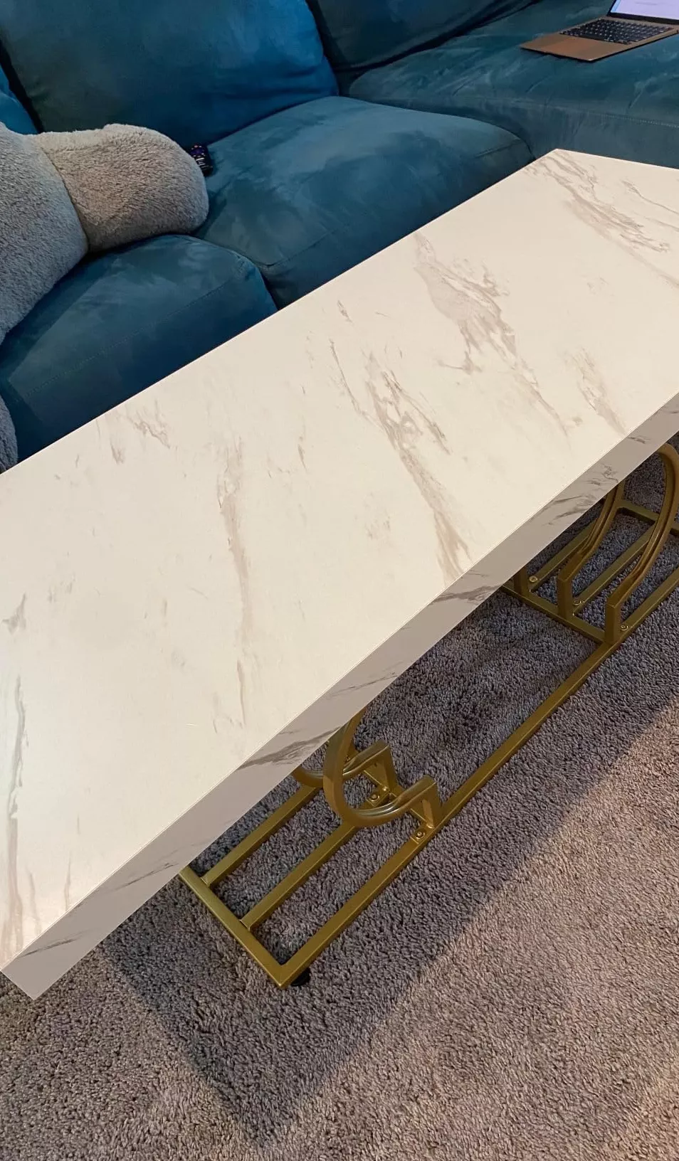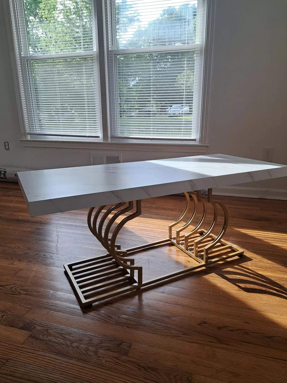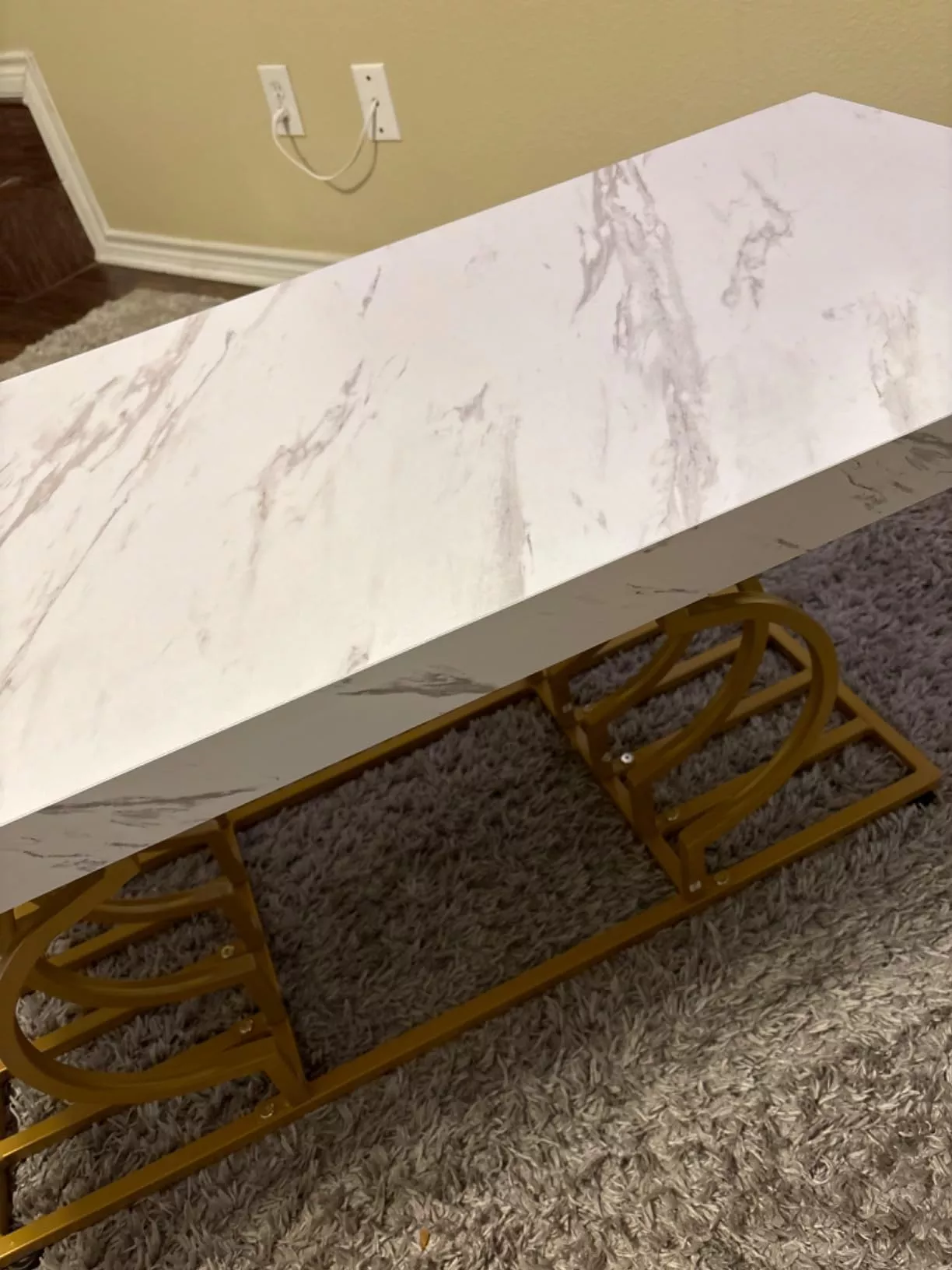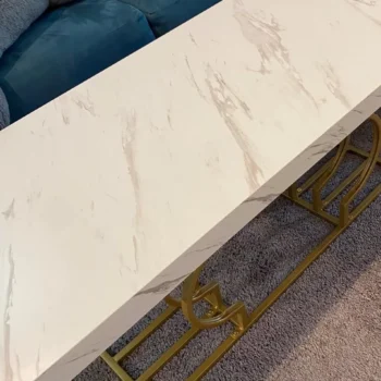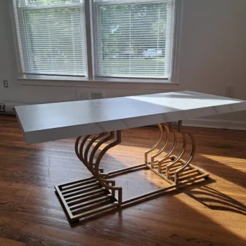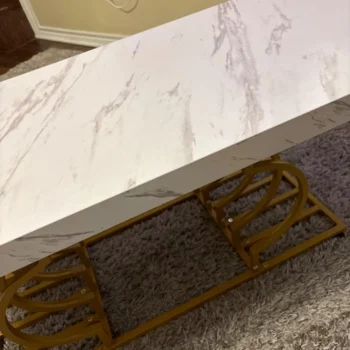 The table’s striking faux marble top, measuring 47.24” W x 19.68” D, provides ample space for your daily needs. Its 1.96-inch thick top, made of warp-resistant MDF and durable laminate, ensures longevity and ease of maintenance. The luxe geometric gold frame, with its double C-shape cutouts, offers both stability and a touch of modern artistry. Its solid, rust-proof metal frame can support up to 220 lbs, making it as sturdy as it is stylish.
