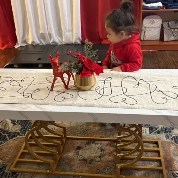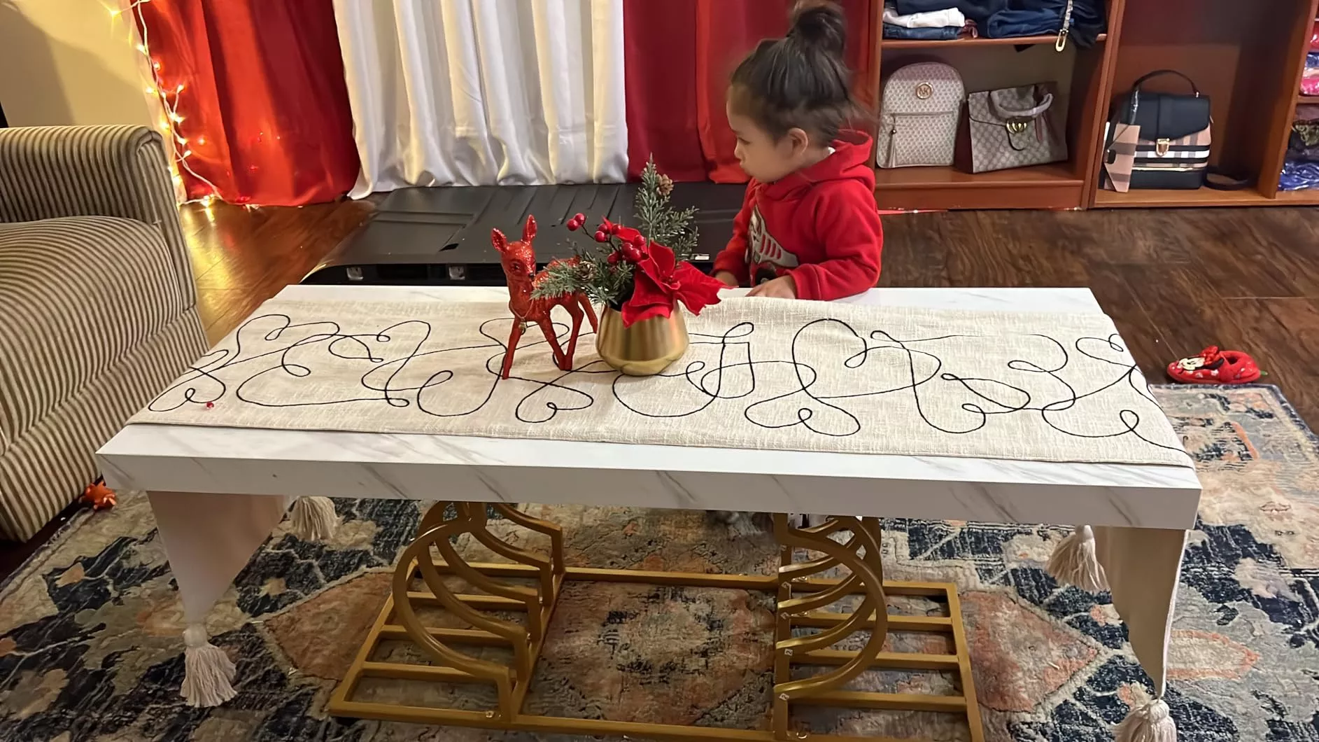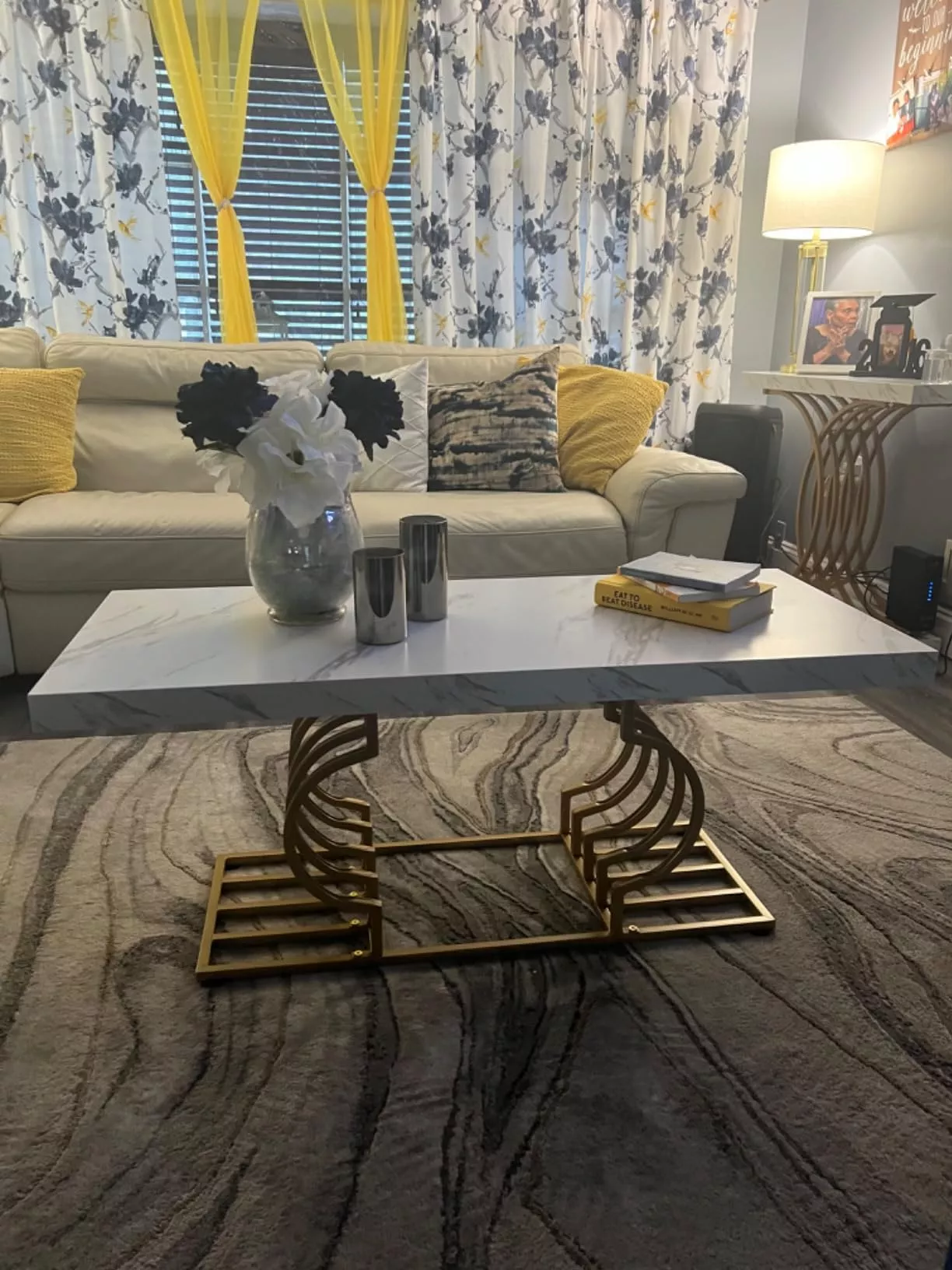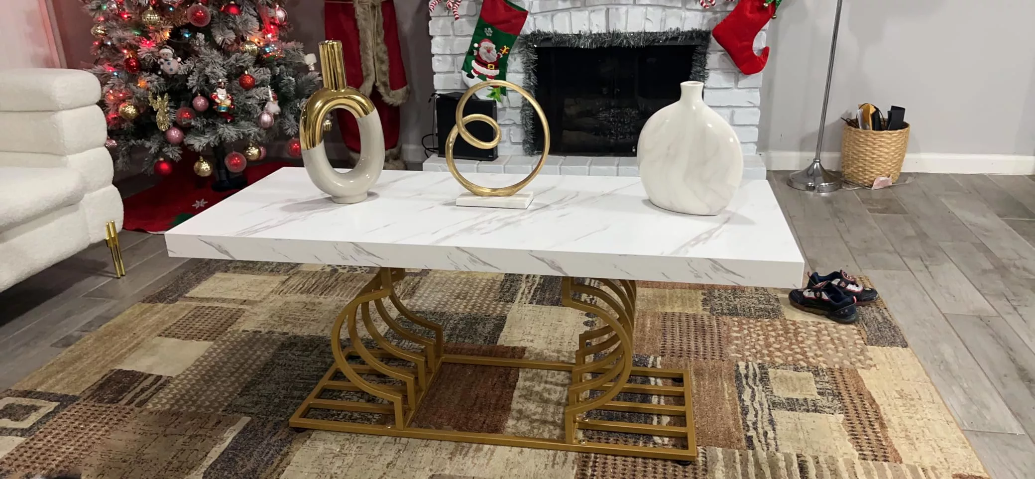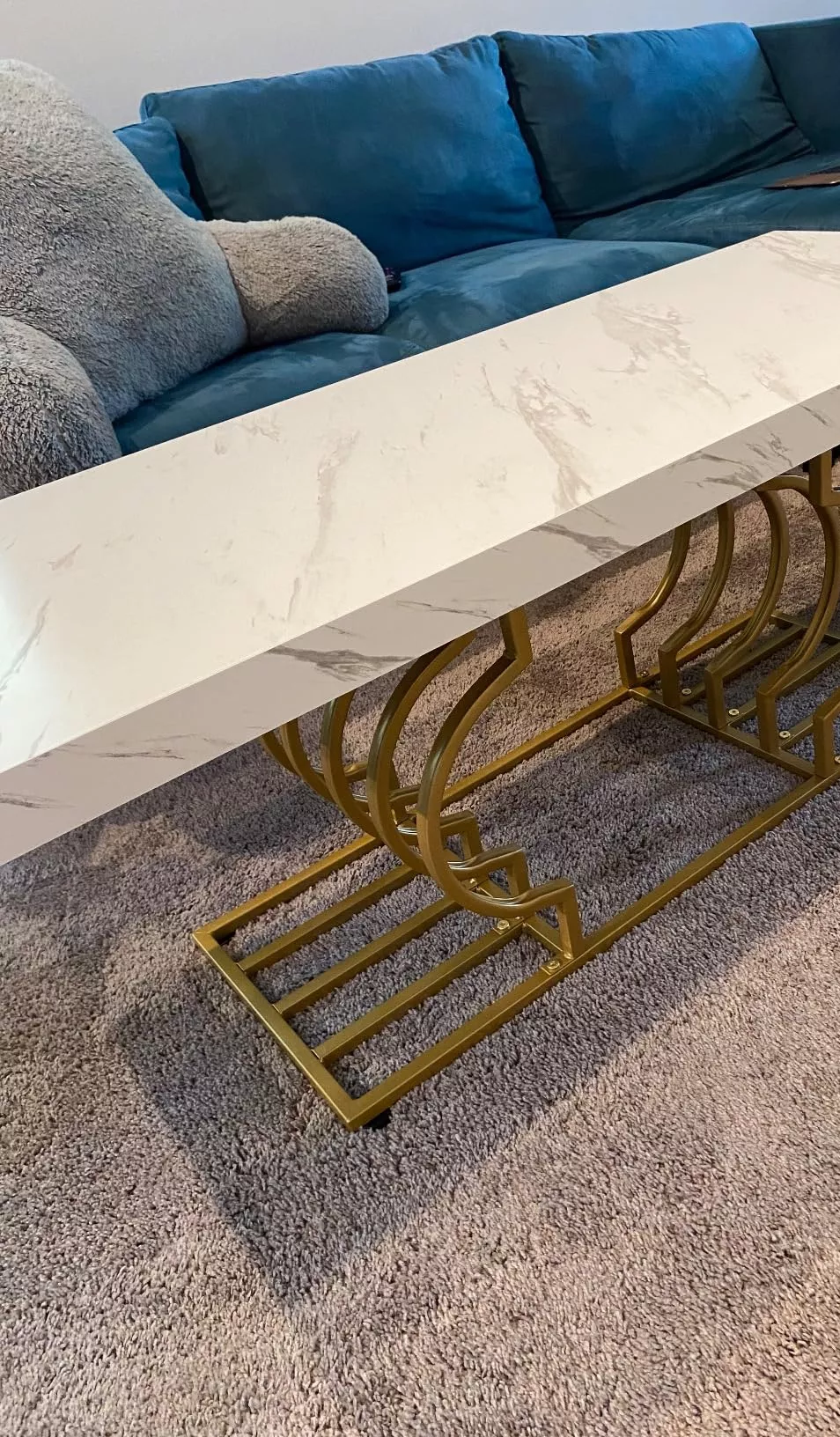 The table’s striking faux marble top, measuring 47.24” W x 19.68” D, provides ample space for your daily needs. Its 1.96-inch thick top, made of warp-resistant MDF and durable laminate, ensures longevity and ease of maintenance. The luxe geometric gold frame, with its double C-shape cutouts, offers both stability and a touch of modern artistry. Its solid, rust-proof metal frame can support up to 220 lbs, making it as sturdy as it is stylish.