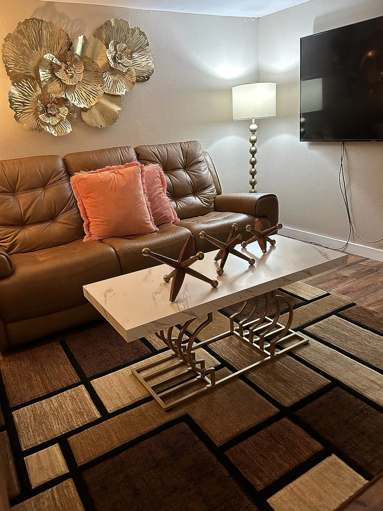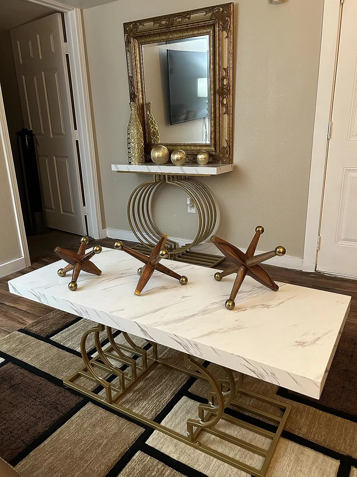 Elegant Faux Marble Coffee Table with Geometric Gold Frame