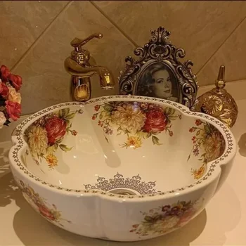 Enhance the beauty of your bathroom with our Elegant Petal Shaped Ceramic Vessel Sink with Antique Brass Faucet. This stunning wash basin features a unique flower and bird pattern, hand-painted to bring a touch of nature indoors. The round, petal-shaped design offers a sleek, modern look that fits perfectly in contemporary bathroom settings. Made from high-quality ceramic, this sink ensures durability and longevity, making it a perfect addition to your home. With a sink length of 15.8 inches and a height of 5 inches, this above-counter vessel sink is designed for ease of use and aesthetic appeal. The set includes an antique brass faucet, standing at 9.2 inches in height, with a spout height of 8.8 inches and a reach of 6.4 inches. The solid brass construction of the faucet guarantees lasting durability, while the stainless steel waste pop-up drain in a matching antique brass finish adds a cohesive look to your bathroom.