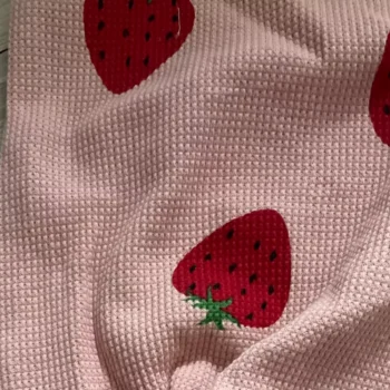 • Adorable pink fabric with cheerful strawberry print