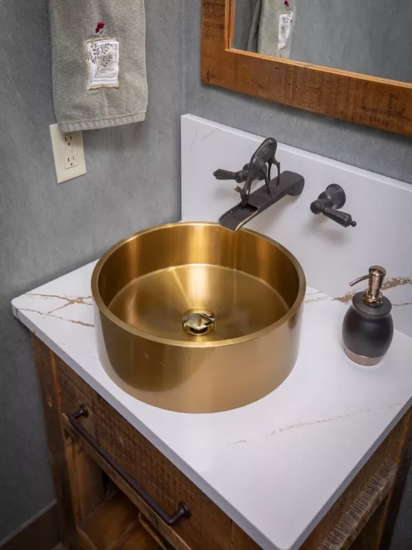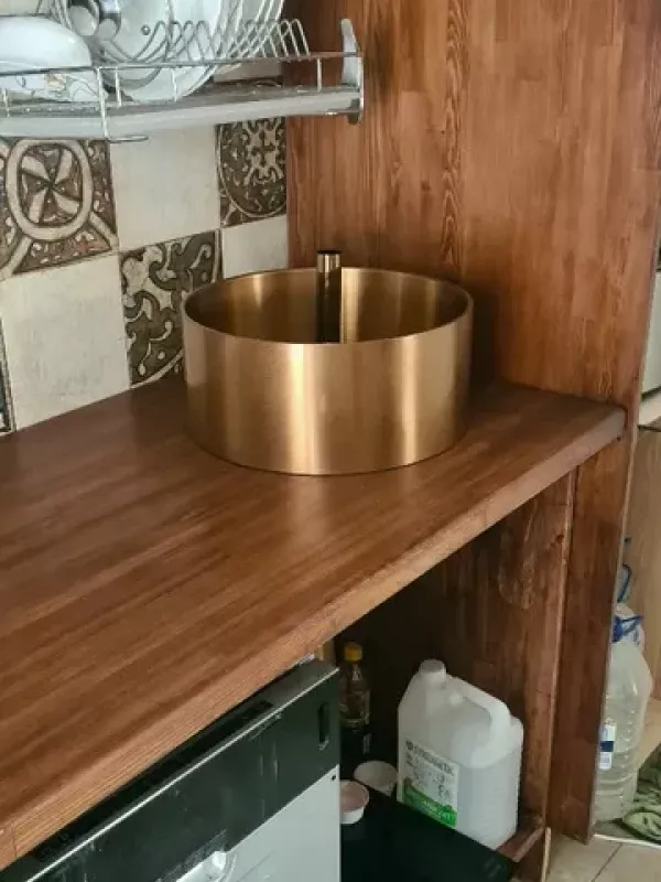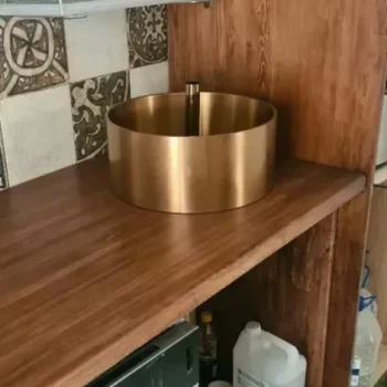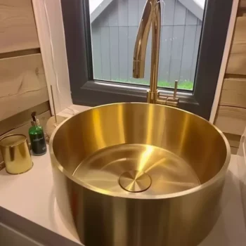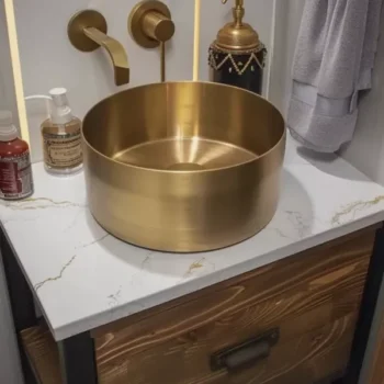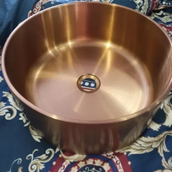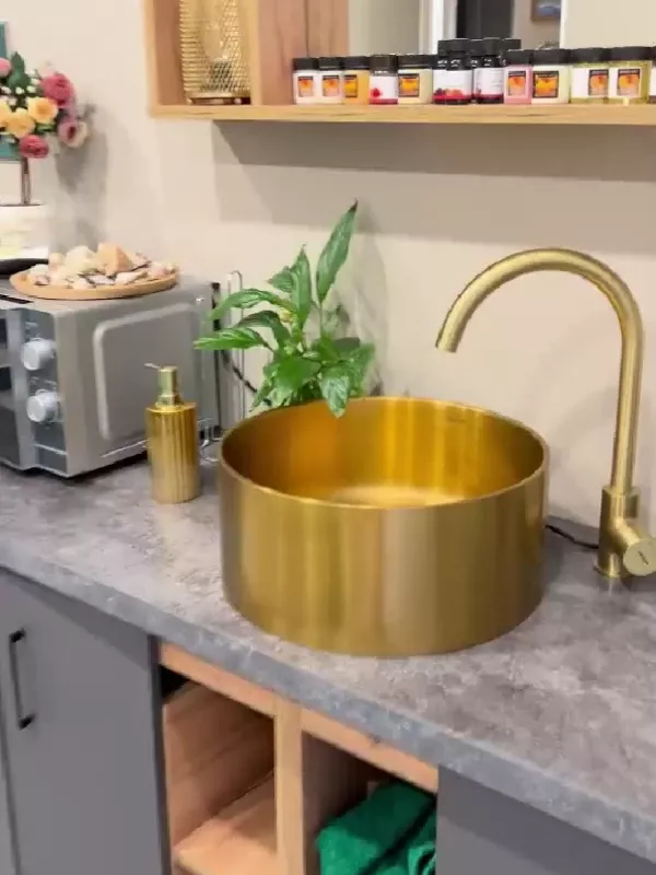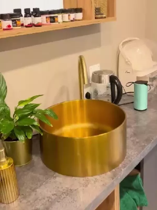 Best utilized in the settings of a luxurious hotel, a chic villa, or a stylish home bar, this gold countertop sink serves as both a functional fixture and a piece of art. Its round elegance is perfect for those moments of self-care, elevating the simple act of washing up into a serene experience. Whether it’s for a quick hand wash or a leisurely hair shampoo, this basin stands ready to cater to your every need.