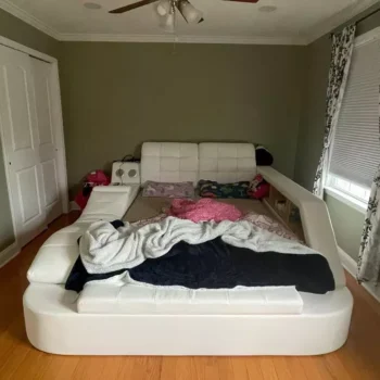 Experience the ultimate in relaxation and innovation with the Luxury Smart King Bed Frame. This multifunctional marvel not only provides a stylish modern aesthetic but also integrates advanced features designed for convenience, entertainment, and comfort. With built-in massage functionality, Bluetooth speakers, a USB charging station, and ample storage space, this bed frame is more than just a place to sleep—it’s a smart home upgrade.