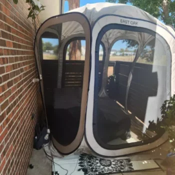 This portable tent stands out with its thoughtful design and premium materials used. Its fiberglass and carbon steel frame provide a sturdy base resisting rust and wear while double stitching at zipper connections minimizes tearing – talk about durability!