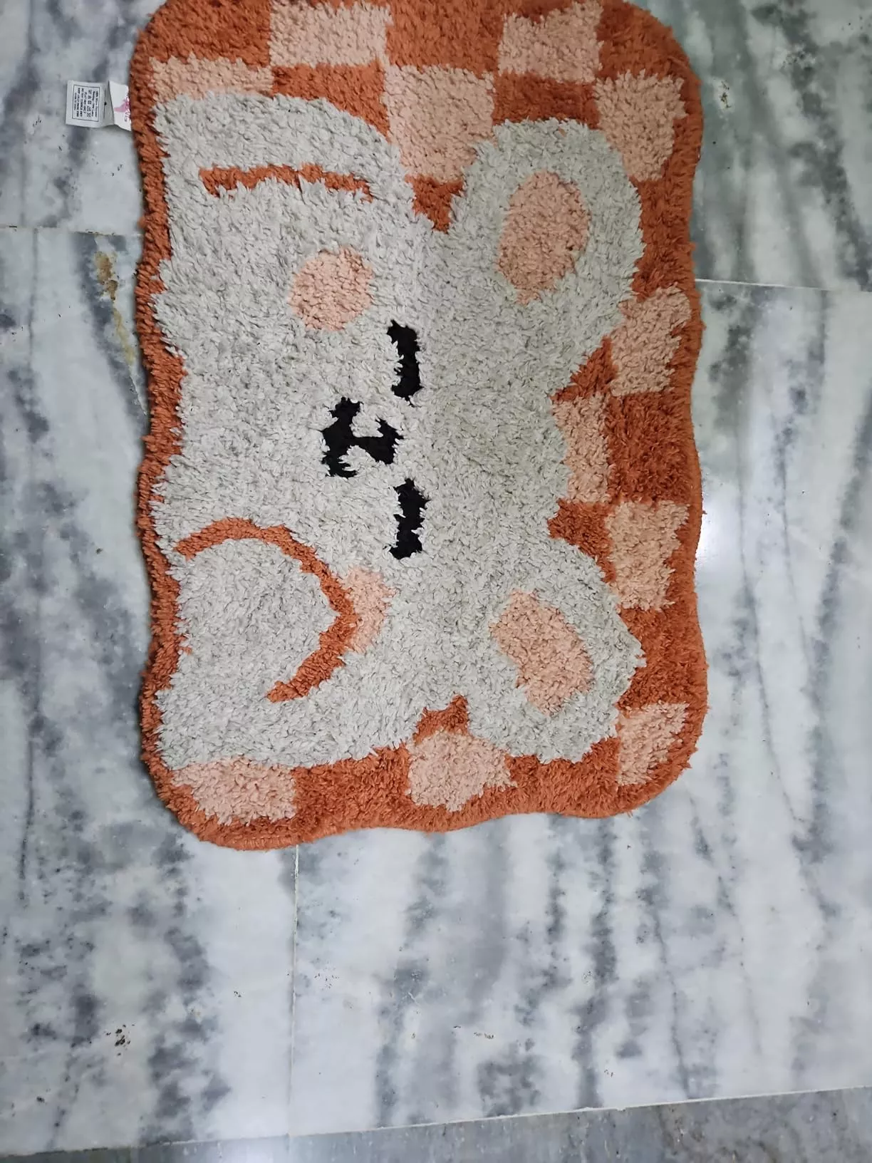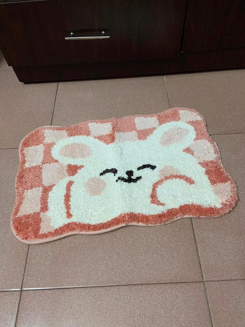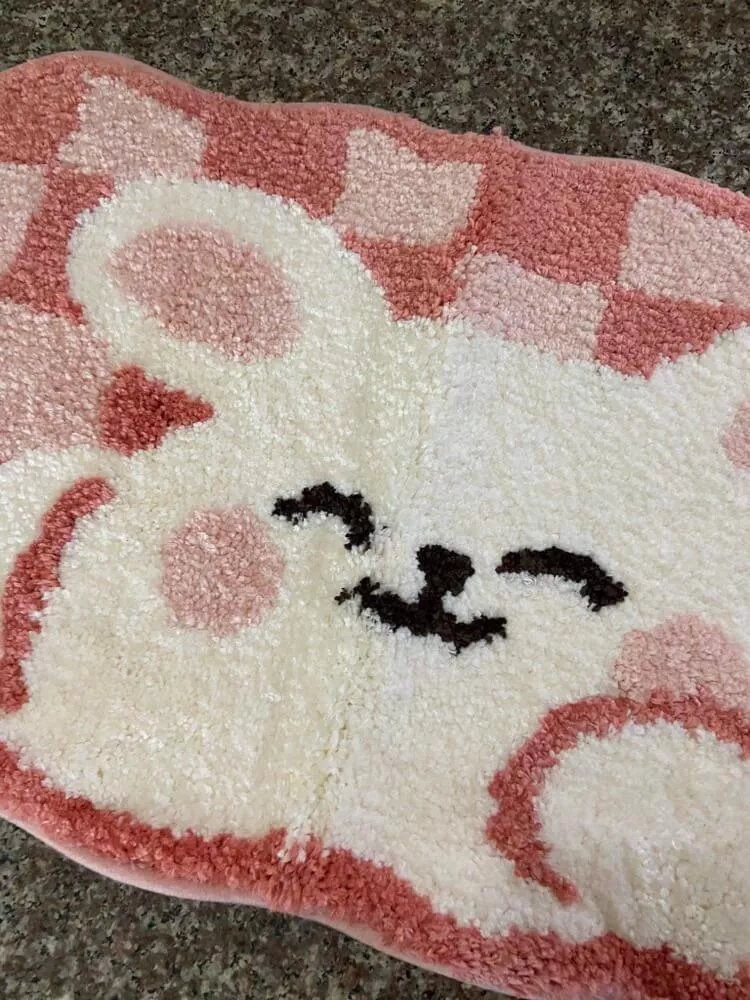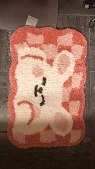 This mat is delightful, offering a thick, luxurious feel, and it washes wonderfully. I have it placed in front of my indoor bunny's litter box, surrounded by stuffed animals to create a cute environment for both of us. It's a solid 10 out of 10 in my eyes.