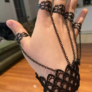 Step into a world of timeless elegance and dark allure with this stunning Vintage Black Lace Hand Chain Bracelet. Designed to captivate, this gothic-inspired piece effortlessly blends vintage charm with bold fashion. Crafted from delicate black lace and durable iron alloy, this statement accessory connects a lace-adorned bracelet to a matching ring with a dainty link chain. It’s a true conversation starter that adds an edge to any look.